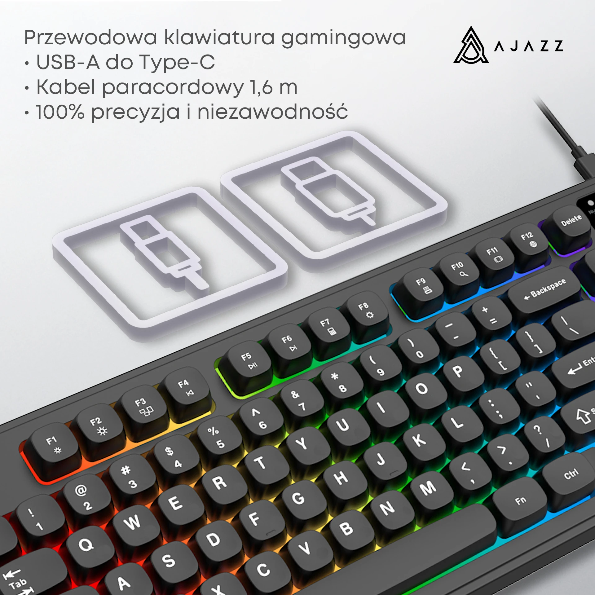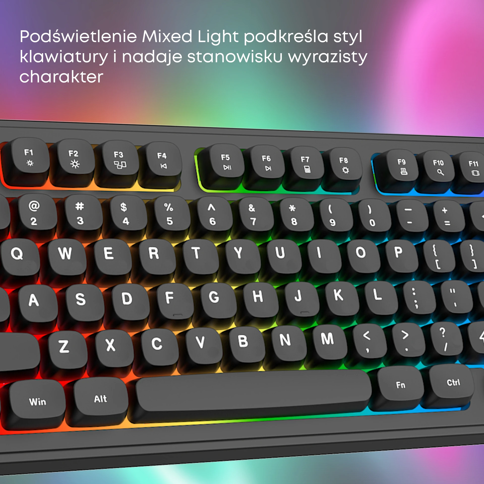 Klawiatura została wyposażona w efektowne podświetlenie Rainbow LED, które poprawia widoczność klawiszy po zmroku i nadaje stanowisku nowoczesny wygląd. To praktyczne rozwiązanie zarówno do pracy, jak i wieczornego użytkowania.