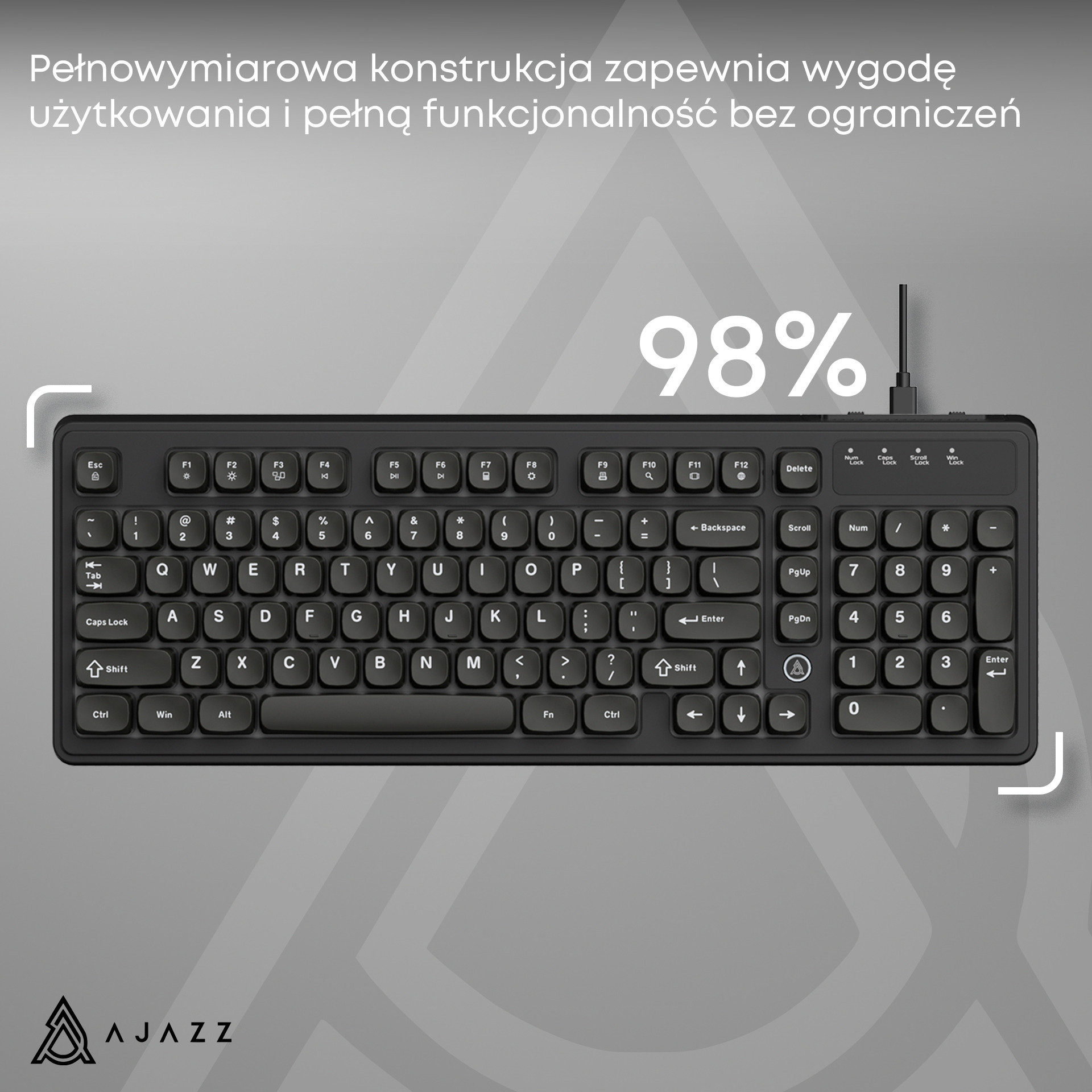 Ajazz AF98 to praktyczna klawiatura przewodowa w formacie 98%, która łączy kompaktowe wymiary z pełną funkcjonalnością. Dzięki zachowaniu bloku numerycznego i klawiszy funkcyjnych oferuje wygodę pracy jak w pełnowymiarowych modelach, jednocześnie zajmując mniej miejsca na biurku.