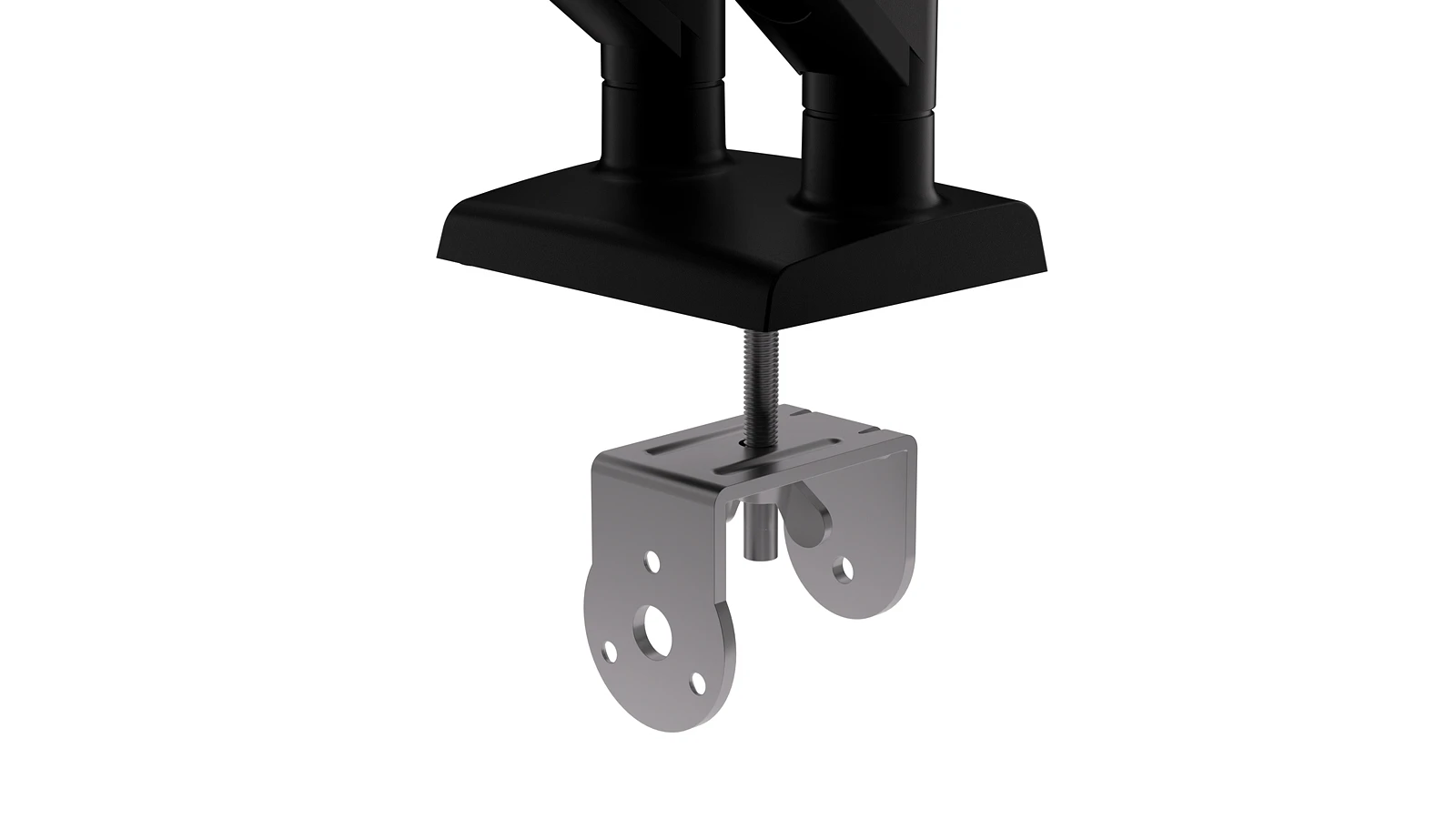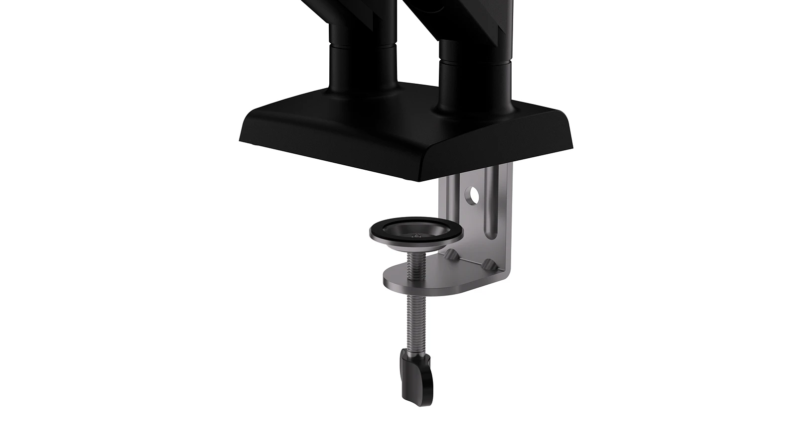 Uchwyt można zamocować za pomocą zacisku typu C lub systemu przelotowego Grommet. Obsługuje blaty o grubości do 70 mm, a ulepszony zacisk pozwala dokręcić konstrukcję od góry – bez schylania się pod biurko. Gumowa podkładka chroni powierzchnię blatu przed uszkodzeniami.